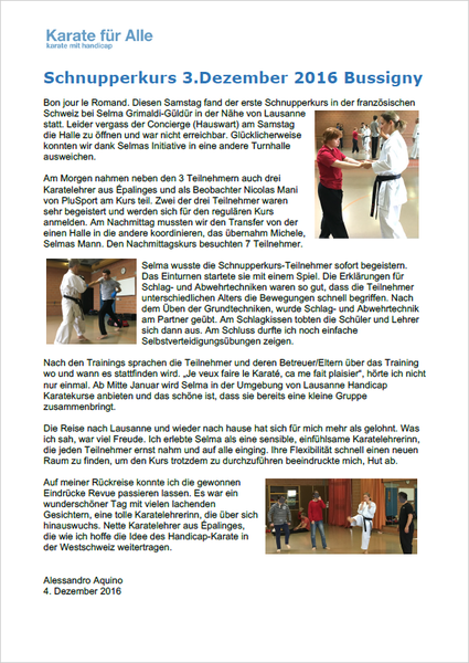 Bon jour le Romand. Diesen Samstag fand der erste Schnupperkurs in der französischen Schweiz bei Selma Grimaldi-Güldür in der Nähe von Lausanne statt. Leider vergass der Concierge (Hauswart) am Samstag die Halle zu öffnen und war nicht erreichbar. Glücklicherweise konnten wir dank Selmas Initiative in eine andere Turnhalle ausweichen.