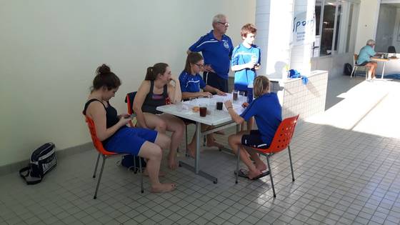 Wer seine Disziplinen geschwommen hatte, machte sich auf den Weg zum Duschen und Umziehen, so dass es in den Umkleidegarderoben kein Chaos gab. Auch im Restaurant waren sie sehr froh, dass die Gruppen gestaffelt zum Mittagessen kamen. Bei Spaghetti mit drei verschiedenen Saucen und Salat à Diskretion konnte der Hunger gestillt werden - einige hatten richtig Kohldampf nach so vielen Einsätzen. Die Rangverkündigung wurde bei dem schönen Wetter draussen vor dem Hallenbad um 14.30 Uhr durchgeführt. Somit hatte jede Person Zeit, in Ruhe die Spaghetti und auch noch einen Kaffee mit etwas Feinem dazu zu geniessen.