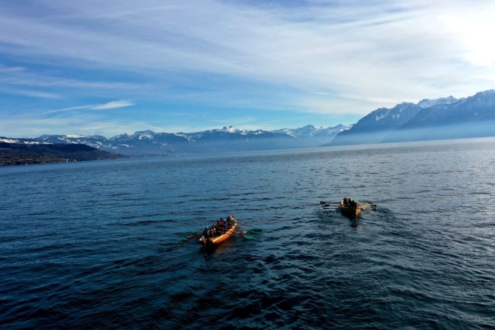Sur la ligne de départ se trouvent 19 athlètes et 15 membres du staff, rejoints par plus de 80 coureurs amis venus partager les premiers kilomètres de l’aventure. Au total, plus d’une centaine de participants s’élancent pour cette première étape. Après que plusieurs personnalités ont pris la parole avant le départ, puis le coup d’envoi a été donné à 8 heures précises. Les premiers kilomètres conduisent les coureurs vers Forel-Lavaux, où un premier ravitaillement attend les sportifs. Le peloton poursuit ensuite sa route en direction de la Tour de Gourze, avant d’entamer une spectaculaire descente à travers les vignobles de Lavaux, avec une vue imprenable sur le Lac Léman. Tout au long du parcours, familles, amis et curieux encouragent les participants. La première partie de l’étape s’est terminée à Lausanne, au Musée olympique, où les participants ont été accueillis sous les applaudissements. Après une cérémonie officielle, les athlètes embarquent dans trois bateaux de sauvetage des sections du Bouveret, de Cully et Lutry pour une traversée du Lac Léman longue de 23 kilomètres. La traversée dure plus de trois heures et demie et nécessite plus de 4000 coups de rame. Après l’arrivée, ils ont poursuivi à vélo jusqu’à Aigle, où ils ont terminé la première journée par un dîner convivial.